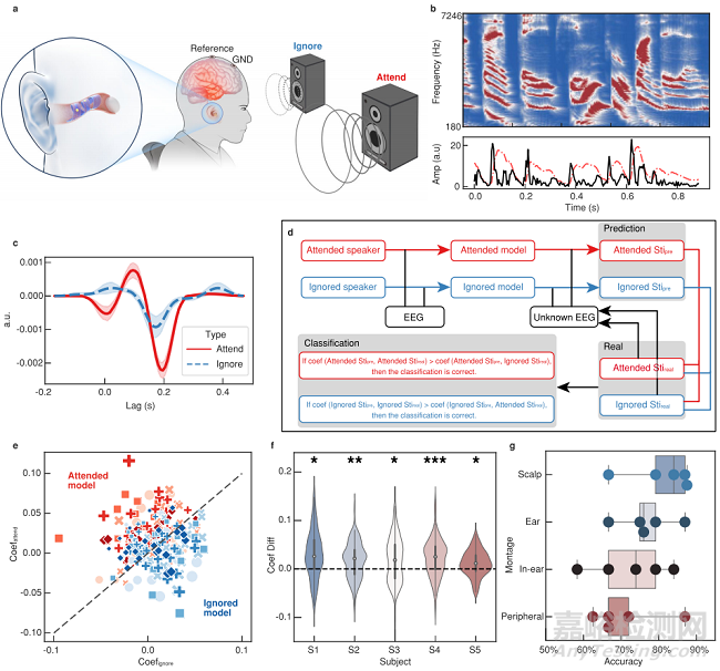 基于采集到的α波數(shù)據(jù),研究團(tuán)隊(duì)提出了由SSVEP-BCI和聽(tīng)覺(jué)BCI(組成的耳內(nèi)腦機(jī)接口范式。前者解碼顯性視覺(jué)注意力,后者解碼自然語(yǔ)音場(chǎng)景中的隱性聽(tīng)覺(jué)注意力。