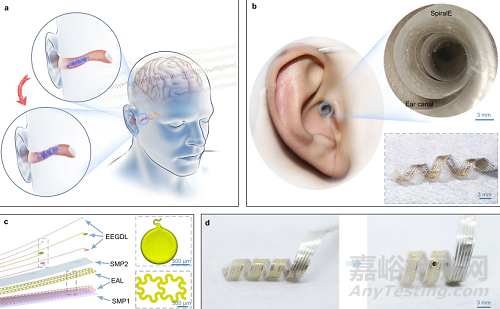 SpiralE的主要組件包括由電熱驅(qū)動(dòng)層(EAL)和EEG檢測(cè)層(EEGDL)嵌入的雙層形狀記憶聚合物(SMP)。3D螺旋狀態(tài)的外層由導(dǎo)電金線和絕緣聚酰亞胺(PI)組成。高模量的材料提供了足夠的支撐,減少了由運(yùn)動(dòng)偽影引起的EEG監(jiān)測(cè)的不穩(wěn)定性。同時(shí),該設(shè)備以螺旋形狀支撐在耳道上完成耳內(nèi)EEG記錄,進(jìn)一步減少了設(shè)備與耳道的磨損和摩擦,提高舒適性與數(shù)據(jù)記錄的準(zhǔn)確性。