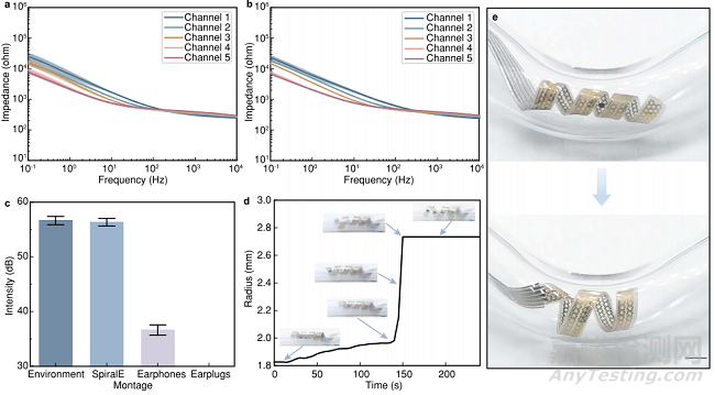 隨后,研究團(tuán)隊(duì)對(duì)Spiral E 的疲勞特性及電阻抗特性進(jìn)行了驗(yàn)證。結(jié)果表明,Spiral E在承受400次10%拉伸應(yīng)變循環(huán)任務(wù)后,其機(jī)械特性及電化學(xué)特性均未發(fā)生顯著改變;Spiral E在初始平坦?fàn)顟B(tài)、永久重構(gòu)螺旋狀態(tài)、臨時(shí)螺旋狀態(tài)和恢復(fù)螺旋狀態(tài)下的阻抗差異不大,證實(shí)了SpiralE的電化學(xué)穩(wěn)定性。同時(shí)基于Spiral E的螺旋結(jié)構(gòu)設(shè)計(jì),即使在執(zhí)行任務(wù)的過(guò)程中外界聲音也會(huì)實(shí)時(shí)無(wú)損地傳輸?shù)绞茉囌叩亩?,而基于耳機(jī)和耳塞的入耳式電子設(shè)備很難實(shí)現(xiàn)這一點(diǎn)。
