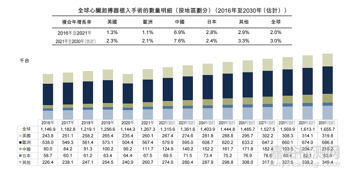 全球進行的?臟起搏器植入?術的數量預期將由2021年的1.3百萬臺增加至2030年的1.7百萬臺,復合年增長率為3.0%。于2021年,歐洲進行的?臟起搏器植入?術約為567,400臺,占全球所有區(qū)域市場中最多(44.8%)。預期中國的?臟起搏器植入?術增長率最高,2021年至2030年的估計復合年增長率為7.6%。下圖載列全球進行的?臟起搏器植入?術的數量。