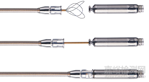 不僅如此,雅培還開發(fā)了專用的AVEIR輸送和取出導管,其為一種帶偏轉機構的可操縱輸送導管,獨特的三環(huán)圈套結構能夠和AVEIR進行裝配,如下圖所示:
