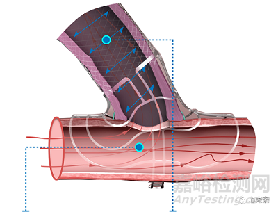 VasQ(血管外支架植入物)由兩個(gè)鎳鈦合金組件組成,一個(gè)部分(Brace)是激光切割的支撐部包裹動(dòng)靜脈瘺吻合口的動(dòng)脈,使吻合口角度為40-50度,并形成1mm的曲率半徑;另一部分(Braid)是外部的網(wǎng)狀編織物,確定血管直徑和梯度,位于吻合口的靜脈近端且不接觸血流。通過(guò)VasQ確保吻合口最佳角度來(lái)糾正血流動(dòng)力學(xué)紊亂導(dǎo)致的內(nèi)膜增生與狹窄。
