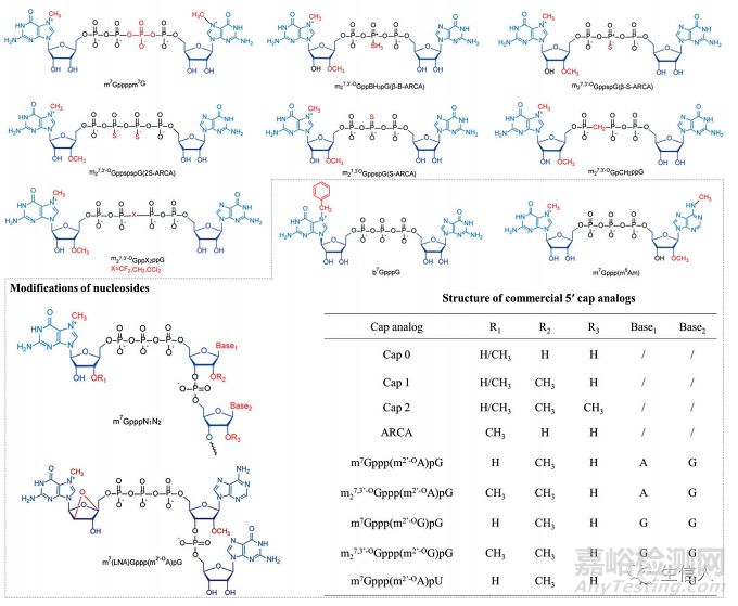 這一部對mRNA設(shè)計進行了介紹。首先介紹的是5 '帽。5 '帽位于mRNA的5 '端,甲基化程度不同(圖5),許多mRNA結(jié)構(gòu)優(yōu)化策略致力于優(yōu)化帽類似物。接著介紹的是poly(A)尾。Poly(A)尾通常由10-250個腺嘌呤核糖核苷酸組成。Poly(A)尾是mRNA的動態(tài)添加物,其的長度對mRNA翻譯效果和蛋白表達(dá)起著至關(guān)重要的調(diào)控作用。