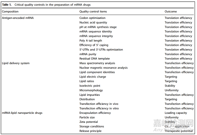 表1. mRNA藥物制備中的關(guān)鍵質(zhì)量控制