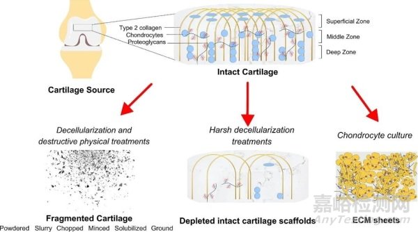 然而,自體軟骨植入物與供體部位發(fā)病率相關,并且具有嚴重的采購限制,因此,同種異體和異種支架被證明是更可行的選擇。異種組織是一種特別有吸引力的替代品,由于免疫原性的問題需要脫細胞過程,可能導致關鍵ECM蛋白的去除和軟骨結構的損失(圖2)。