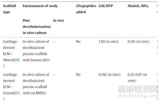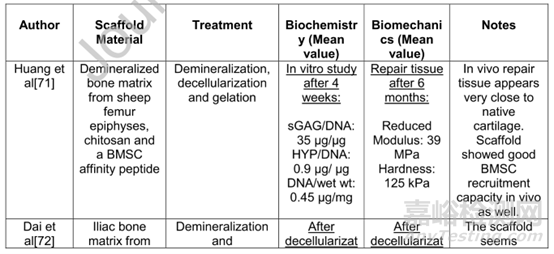 良好的支架具有最佳的結構、可降解性、機械強度、生物相容性、孔徑、孔隙率、互連性和滲透性。多項研究報道,軟骨ECM提取物可以促進胚胎干細胞的軟骨特異性分化、在沒有外源GF的情況下的軟骨形成分化以及與補充GF的協同作用。此外,作者還總結了軟骨來源的ECM支架列表,包含有關源材料類型、應用的治療、生化/生物力學特性和研究結果的信息。