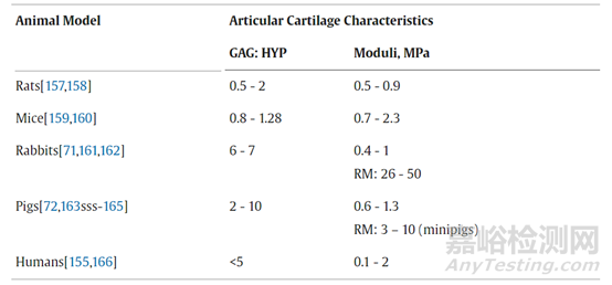 因此,作者首先收集了常用動物模型中關節(jié)軟骨的GAG:HYP 比率、聚合/楊氏模量和折減模量(RM)(如果適用)(表3)。接下來,對本次綜述中38項研究的一部分——特別是那些報告積極的體外/體內結果以及修復組織生物化學和/或生物力學信息的研究進行了匯編和檢查(表4),然后將這些特征與天然宿主軟骨進行比較。
