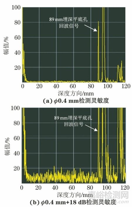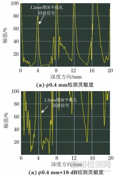 分別對(duì)埋深為1.52,3.20,6.35 mm的ф0.4 mm平底孔進(jìn)行全聚焦成像檢測(cè),在ф0.4 mm檢測(cè)靈敏度下,使埋深為6.35 mm平底孔的回波信號(hào)達(dá)到滿量程為80%時(shí),與其相鄰界面回波的相交處信號(hào)不大于滿量程的20%,可以與界面回波明顯區(qū)分,而埋深1.52和3.20 mm的平底孔則無(wú)法分辨。采用上述多深度聚焦檢測(cè)方法,聚焦于第一分區(qū)(即10 mm深度位置)時(shí),結(jié)果顯示3個(gè)不同埋深的平底孔均難以分辨。