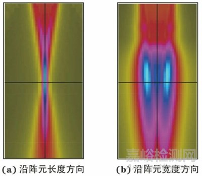 頻率為10 MHz、陣元晶片個(gè)數(shù)為32、陣元間距為0.6 mm的線形陣列探頭聚焦于40 mm深度位置時(shí)的聲場(chǎng)分布如圖1所示,可見超聲線陣探頭在沿陣元排列方向上聲束聚焦能力很強(qiáng),但在沿陣元寬度方向上聲束沒有形成聚焦。