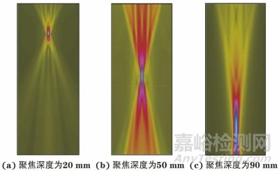 通常使用超聲環(huán)形陣列探頭,基于相控陣多深度聚焦檢測(cè)技術(shù),設(shè)置聚焦延遲法則使同一環(huán)形陣列發(fā)射的聲束分別聚焦于不同深度的位置,以代替多個(gè)不同焦距的常規(guī)水浸聚焦探頭,從而實(shí)現(xiàn)粉末高溫合金材料的C掃描檢測(cè)。通過CIVA仿真軟件模擬環(huán)形陣列探頭不同聚焦深度時(shí)的聲場(chǎng)分布。當(dāng)聚焦深度較淺時(shí),聲場(chǎng)能量高度集中在較小的焦區(qū)內(nèi),而在該聚焦深度范圍外聲束會(huì)明顯發(fā)散,但隨著聚焦深度的增加,聲場(chǎng)聚焦效果逐漸下降,焦柱的軸向長(zhǎng)度會(huì)逐漸增加。