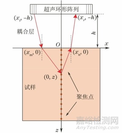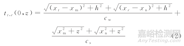 式中:cw為耦合層(水或楔塊)中的聲速;cs為試樣中的聲速;xt為第t號(hào)激勵(lì)陣元的位置;xr為第r號(hào)接收陣元的位置;xm為發(fā)射聲波在耦合層-試樣界面的折射點(diǎn)位置;xn為接收聲波在耦合層-試樣界面的折射點(diǎn)位置;h為耦合層的高度。
