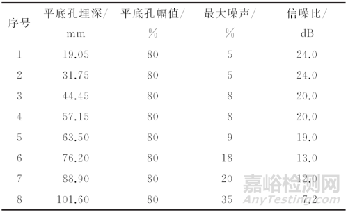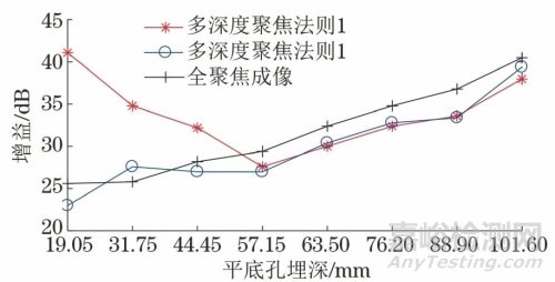 在上述粉末高溫合金平底孔對(duì)比試塊上,分別采用全聚焦成像方法和多深度聚焦檢測(cè)方法開展檢測(cè)靈敏度試驗(yàn)。全聚焦成像方法的聚焦點(diǎn)間隔為0.1 mm,多深度聚焦檢測(cè)方法采用了兩種聚焦法則,其中法則1的聚焦起點(diǎn)為10 mm、聚焦終點(diǎn)為100 mm,聚焦點(diǎn)間隔為15 mm,共計(jì)7個(gè)聚焦深度;法則2的聚焦起點(diǎn)為10 mm、聚焦終點(diǎn)為100 mm,聚焦點(diǎn)間隔為10 mm,共計(jì)10個(gè)聚焦深度。