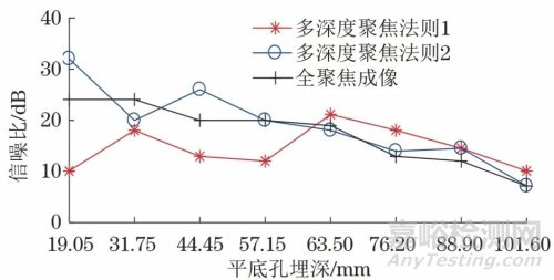 對(duì)于高靈敏度檢測(cè),噪聲信號(hào)會(huì)較為明顯,因此,在ф0.4 mm平底孔當(dāng)量靈敏度下增加18 dB,記錄噪聲水平,進(jìn)一步評(píng)價(jià)檢測(cè)信噪比。采用全聚焦成像方法在ф0.4 mm+18 dB的檢測(cè)靈敏度下,除埋深為101.60 mm平底孔缺陷的噪聲為35%外,其余均為5%~20%,各平底孔的信噪比如表1所示。3種檢測(cè)方法的信噪比變化曲線如圖8所示,可見多深度聚焦檢測(cè)方法的信噪比波動(dòng)也較大,當(dāng)聚焦深度為7個(gè)時(shí),信噪比為10.0~21.2 dB;當(dāng)聚焦深度為10個(gè)時(shí),信噪比為7.2~32.0 dB。在信噪比方面,全聚焦成像方法與多深度聚焦檢測(cè)方法基本相當(dāng),在ф0.4 mm+18 dB的檢測(cè)靈敏度下,二者均滿足信噪比不小于6 dB的要求。