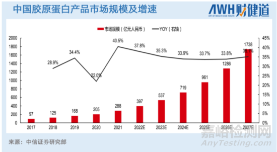 弗若斯特沙利文相關(guān)數(shù)據(jù)顯示,我國膠原蛋白產(chǎn)品市場零售額由2017年的97億元提升至2021年的288億元,年復(fù)合增速達(dá)到35%。