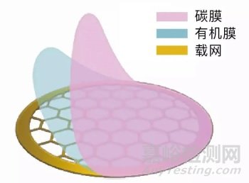 載網(wǎng)支持膜,俗稱銅網(wǎng),或者碳網(wǎng),具體組成如圖3 所示。其主要分為三個(gè)部分:最下層是具有一定目數(shù)的金屬網(wǎng),可以是銅網(wǎng)、鎳網(wǎng)、金網(wǎng)等。金屬網(wǎng)上面為有機(jī)層(方華膜),最上面為一層碳膜。根據(jù)測(cè)試和樣品需求不同,載網(wǎng)的選擇也不盡相同。