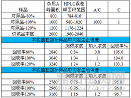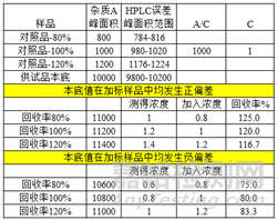 ③供試品溶液不穩(wěn)定,供試品分析時(shí)長(zhǎng)90min,在進(jìn)樣室中供試品不斷降解成特定雜質(zhì)C,導(dǎo)致雜質(zhì)C的回收率異常高,可達(dá)200%左右。