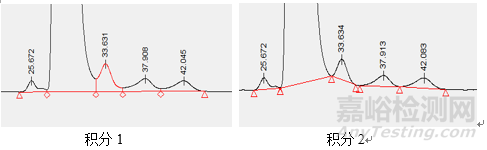 本例中的回收率偏高的原因是基質(zhì)的影響,那么如果供試品的本底在定量限水平遠(yuǎn)遠(yuǎn)不會(huì)影響到回收率的結(jié)果,那么還有哪些原因會(huì)導(dǎo)致回收率偏高呢,排查儀器設(shè)備,玻璃器具,操作不當(dāng)?shù)仍谕猓虬?,①?duì)照品影響,對(duì)照品開(kāi)啟時(shí)間較長(zhǎng)吸潮,或者對(duì)照品的使用不當(dāng)(部分對(duì)照品會(huì)標(biāo)注干燥后使用),這樣造成測(cè)得值的結(jié)果偏高,回收率偏高。②雜質(zhì)B與主峰的分離度基線分離(分離度1.9),雜質(zhì)B的限度為0.5%,回收率的限度要求為90-108%,如下圖所示(雜質(zhì)B的保留時(shí)間為33.6min),那么,積分方式的選擇就對(duì)測(cè)定結(jié)果的影響較大,本例中以外標(biāo)法定量,對(duì)照品溶液與供試品加標(biāo)溶液的積分方式完全一致,模擬一下積分方式變化對(duì)結(jié)果的影響過(guò)程:雜質(zhì)B的加入濃度為1,對(duì)照品溶液中雜質(zhì)B的峰面積為5000,那么A/C為5000,供試品加標(biāo)溶液中雜質(zhì)B為6000,測(cè)得100%水平回收率為120%。當(dāng)調(diào)整積分方式為峰谷到峰谷之后,對(duì)照品溶液中雜質(zhì)B的峰面積為4800,那么A/C為4800,供試品加標(biāo)溶液中雜質(zhì)B為5000,測(cè)得100%水平回收率為104%。