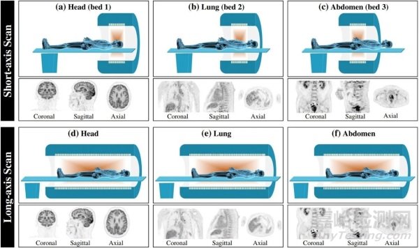 圖1 長、短軸PET系統(tǒng)在3個(gè)床位(腦部、肺部和腹部)的成像效果比較