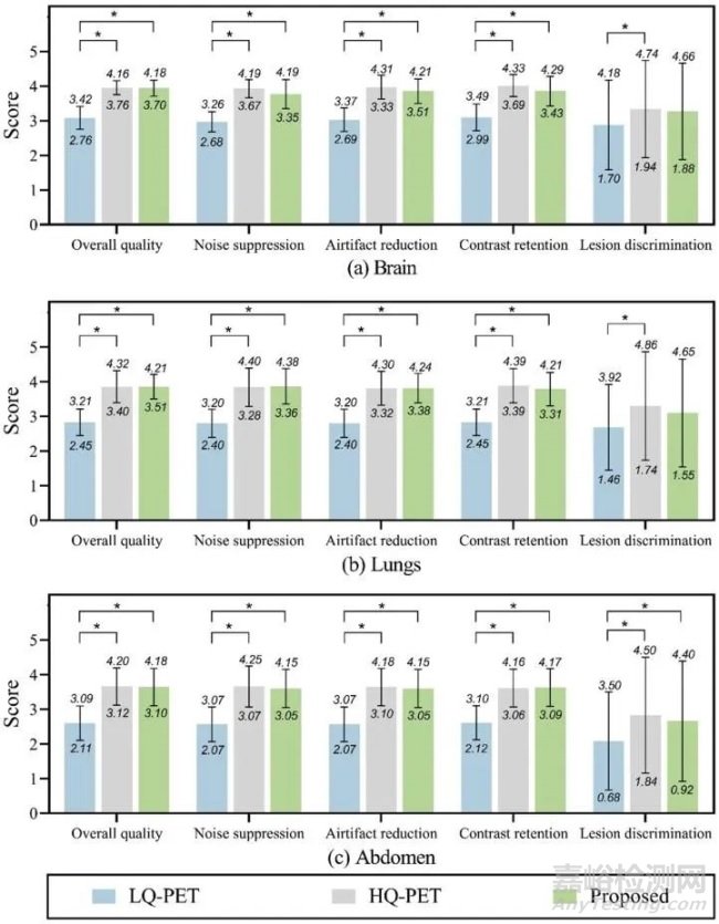 近日,中國科學(xué)院深圳先進(jìn)技術(shù)研究院胡戰(zhàn)利研究員與河南省人民醫(yī)院影像科王梅云主任等合作研發(fā)了長軸引導(dǎo)短軸PET圖像質(zhì)量提升策略方法。臨床面向3個(gè)短床位(腦部、肺部和腹部)采集超過335例人體掃描數(shù)據(jù)和對應(yīng)的長軸PET影像數(shù)據(jù),基于3D網(wǎng)絡(luò)模型構(gòu)建長短軸質(zhì)量提升的映射函數(shù)。臨床實(shí)驗(yàn)結(jié)果表明,短軸PET影像在3個(gè)床位上均能取得優(yōu)越的圖像質(zhì)量評價(jià)指標(biāo)(峰值信噪比PSNR分別超過35dB、33dB和38dB,統(tǒng)計(jì)學(xué)指標(biāo)p值均小于0.05)(圖2);另外,醫(yī)生的主觀評價(jià)和定量數(shù)值分析也表明,提出的策略方法極大地改善短軸PET影像質(zhì)量(圖3)。本研究為短軸PET影像質(zhì)量提升提供了一種低成本升級策略,也為相關(guān)生物醫(yī)學(xué)儀器升級改造開辟了新的思路方向。