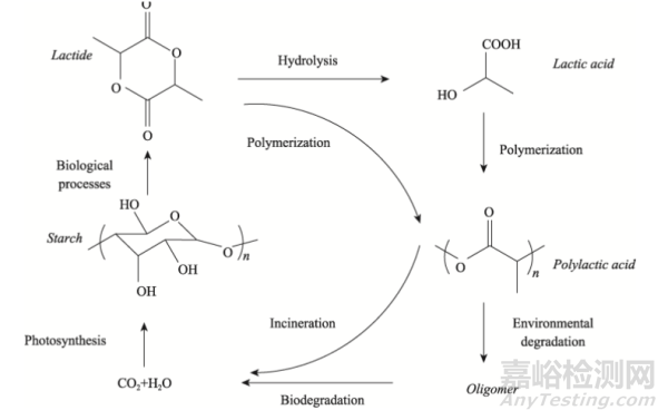 作為一種可堆肥降解的聚合物,PLA可由玉米、馬鈴薯、甜菜等農(nóng)作物原料發(fā)酵而成,具有良好的熱塑性、力學(xué)性能、阻隔性能、透明度并且易于加工。PLA產(chǎn)品使用后直接堆肥將完全降解為CO2和H2O(如下圖所示),符合可持續(xù)發(fā)展的要求,可用作包裝材料,其纖維還被用于制造一次性用品、汽車、服裝、電子產(chǎn)品和醫(yī)療衛(wèi)生設(shè)備等。美國(guó)食品藥物管理局(FDA)認(rèn)證PLA為安全材料。