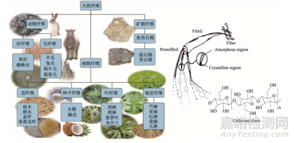 天然纖維在加工過(guò)程中具有較好的靈活性、高固化性、易接近性、可生物降解性、低成本和生態(tài)友好性等諸多優(yōu)點(diǎn),常見(jiàn)的天然纖維有黃麻、亞麻、紅麻、大麻、苧麻、劍麻、菠蘿、棉花、木棉、椰子、竹子、象草等,部分分類如下圖所示。大部分的天然纖維都是由纖維素、半纖維素、木質(zhì)素、蠟質(zhì)和幾種水溶性纖維組成的。