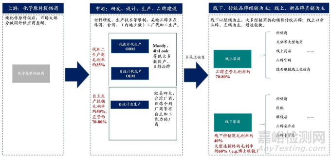 隱形眼鏡產(chǎn)業(yè)主要材料商、生產(chǎn)及品牌商、銷售渠道三個主要環(huán)節(jié):