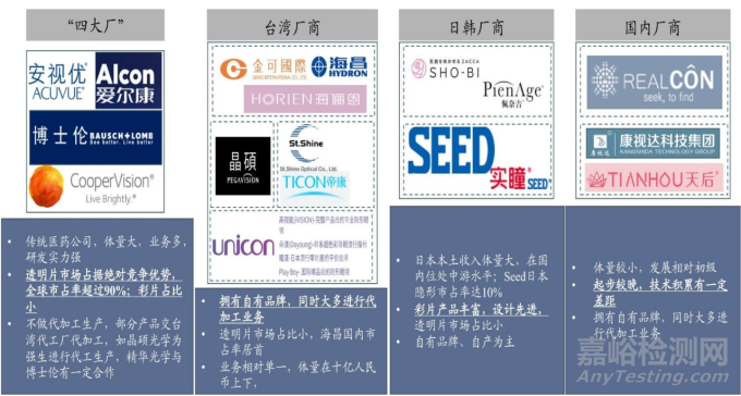 當(dāng)前國內(nèi)生產(chǎn)廠家主要有四類:1)目前隱形眼鏡行業(yè)自主生產(chǎn)商仍以國際“四大廠”——強(qiáng)生、博士倫、視康、愛爾康為首。無論是研發(fā)實(shí)力、國際市場地位、品牌認(rèn)可度,都遠(yuǎn)超其他廠商,在透明片市場占據(jù)絕對競爭優(yōu)勢。2)臺灣廠商主要包括金可國際,精華光學(xué),晶碩光學(xué),優(yōu)你康光學(xué)等,生產(chǎn)能力積淀已久,長期為四大廠、日韓品牌、國產(chǎn)品牌代加工,規(guī)模效應(yīng)顯著,以彩瞳加工為主,除金可國際(海昌)外,其他公司自有品牌影響力較小。3)日韓廠商彩瞳產(chǎn)品豐富,設(shè)計先進(jìn),但受產(chǎn)能限制較大。4)國內(nèi)廠商仍處發(fā)展階段,目前業(yè)內(nèi)認(rèn)可度較高的廠家包括吉林瑞爾康、甘肅康視達(dá)等,產(chǎn)能均超 5 千萬片/年,但自有品牌認(rèn)可度、知名度不及其他廠商,技術(shù)積累也有一定差距。