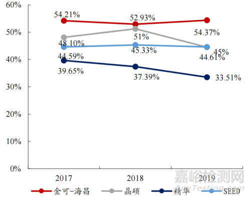▲ 部分上市隱形眼鏡廠商毛利率 (資料來源:精華光學(xué),晶碩光學(xué),金可國際,SEED,興業(yè)證券經(jīng)濟(jì)與金融研究院整理)
