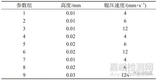討論輥壓輪輥壓工作時相對于打印面下壓的高度以及滾動速度對打印件的性能影響。輥輪工作面高度(即低于打印面的距離)參數設定為0.01,0.02,0.03 mm;輥壓輪滾動的速度(即每秒輥輪滾壓打印面的長度)參數設定為4,6,12 mm/s;通過控制變量法對參數進行設置得到表1的輥壓參數表。