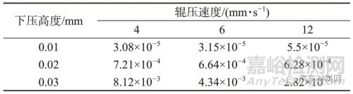 利用ANSYS軟件的Static structure模塊進行數值模擬仿真。設置輥壓輪材料為結構鋼,打印件材料為PLA (自定義其屬性密度為1 250 kg/m3,拉伸彈性模量為3 GPa,泊松比為0.4),為便于計算仿真模型中打印件設置為三層且層厚為0.2 mm,總體尺寸為10 mm×2 mm×0.6 mm;輥輪外直徑為2 mm,長度為4 mm;根據表1中的參數表進行邊界條件設置進而得到在不同輥壓輪下壓高度和不同輥壓速度時的等效應變量見表2。