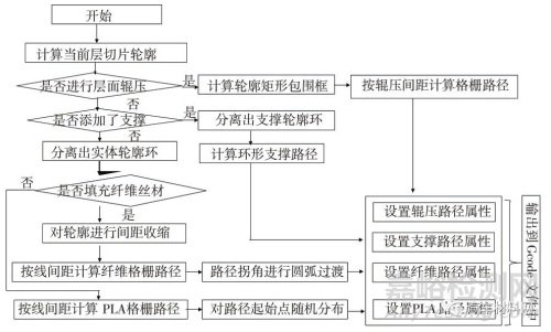 第四步:繼續(xù)在當前切片輪廓分離出實體輪廓環(huán),讀取是否填充纖維絲材參數IsCCF,如果是TRUE,則根據收縮參數對輪廓進行等間距收縮,預留出過渡區(qū)以填充上下表面的PLA路徑。然后在內部根據線間距計算格柵式纖維路徑,并將格柵路徑的拐角進行圓弧過渡,便于纖維拐角鋪送順暢。再在過渡區(qū)進行隨形路徑填充,生成PLA打印路徑,與輪廓環(huán)方向一致,以提高打印的輪廓精度。