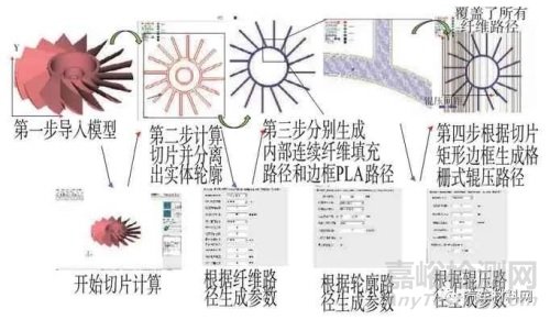 在計算連續(xù)纖維路徑過程中可以根據零件性能的需求設定為間隔一層或間隔N層的方法進行填充,沒有必要每層均填充連續(xù)纖維絲材。間隔層中以PLA來填充,以增強連續(xù)纖維填充層之間的黏接強度提高致密度。由于連續(xù)纖維流動性和線徑的差異,連續(xù)纖維路徑和切片輪廓之間設計了一個過渡區(qū),過渡區(qū)以聚合物絲材填充,將連續(xù)纖維的路徑包裹在內部填充區(qū),同時邊框也以聚合物填充,以提高切片外輪廓精度(如圖4中③號圖)。另外在生成格柵式路徑時,筆者利用設計的寬壓輥在路徑上通過連續(xù)性地沿Y軸往復運動來實現(xiàn)平行線填充,實現(xiàn)實時全幅面層面填充(如圖4中④號圖),在宏觀上提高輥壓平面表面精度,避免了輥壓機構自身對纖維層面的影響。