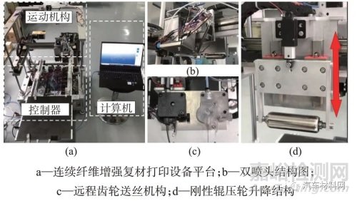 打印平臺的構建主要由結構框架、控制器、計算機組成。計算機發(fā)出控制指令,控制器接收指令后由結構組件執(zhí)行指令。圖5為連續(xù)纖維增強復材3D打印機實物圖。圖5a為雙噴頭組件中執(zhí)行復材噴頭升降、纖維剪切、滾壓、輥壓輪升降功能的關鍵部件;圖5b為連續(xù)纖維復合材料雙噴頭實物圖,包含復合材料噴頭模塊、連續(xù)纖維噴頭模塊并具備纖維剪切機構、剛性輥壓模塊;圖5c為兩種不同絲材的送絲機構,均使用齒輪送絲方式,其復合材料使用直徑為1.75 mm的PLA絲材,纖維材料使用直徑為0.4 mm,外部由尼龍材料包裹的連續(xù)碳纖維絲材;圖5d為行程為10 mm的電推桿,用來控制剛性輥壓輪升降,可實現(xiàn)在非工作時間抬升防止破壞非滾壓區(qū)域。