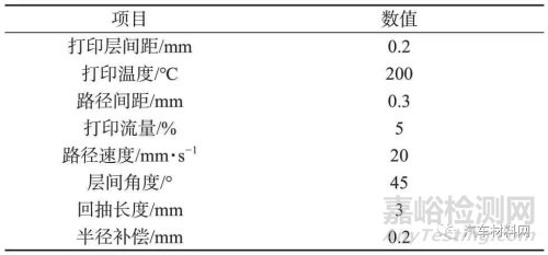 整體打印過程工藝參數包括樹脂基礎材料打印、連續(xù)纖維打印和輥壓三個部分。由表3可見,選用PLA-ST絲材作為基礎絲材,打印溫度為200 ℃,打印路徑間距為0.3 mm,層間角度為45°,打印換層絲材回抽長度為3 mm,減少非打印段多余漏料破壞打印面光滑,進而繼續(xù)打印時絲材回填增量長度為1 mm來保證出絲正常,避免出現(xiàn)缺料產生間隙,打印使用直徑為0.4 mm噴嘴,為保證打印件尺寸設置絲材半徑補償為0.2 mm,噴頭路徑速度為20 mm/s,打印流量設置為5%,可保證送絲電機送料量和噴嘴出料量基本一致避免噴頭堵塞。