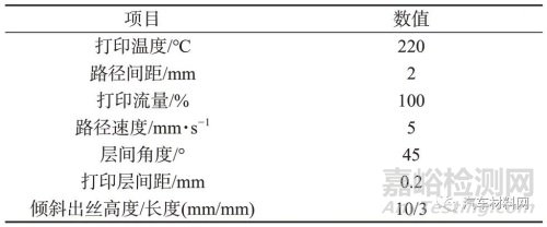 打印連續(xù)纖維工藝參數與打印PLA材料有很大差別,其中送絲速度和噴嘴移動速度一致來保證進料長度和出料長度一致,避免出現(xiàn)送絲量大于或者小于噴嘴出料量導致堵料和缺料現(xiàn)象,所以纖維打印流量應為100%。由表4可知,打印溫度為220 ℃,以保證包裹的尼龍材料充分熔融,噴嘴直徑為1 mm,打印速度為5 mm/s,絲材路徑間距2 mm;傾斜出絲長度為3 mm,傾斜高度為10 mm,即在每次打印纖維材料時定位到預定位置后抬升至側上方下降打印同時出絲3 mm來保證打印起點纖維絲材能夠正常鋪設。纖維層間角度為45°,其填充方式為層疊式填充,填充密度為隔一層填充(即打印一層PLA后打印一層纖維),打印層厚均為0.2 mm。