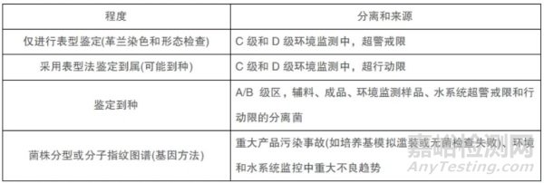 對(duì)潔凈室和其他受控環(huán)境分離到的微生物進(jìn)行適當(dāng)?shù)蔫b定,掌握環(huán)境微生物污染情況,有助于污染調(diào)查。實(shí)際工作中無菌試驗(yàn)陽性結(jié)果中分離出的微生物,經(jīng)對(duì)其溯源分析,確認(rèn)污染歸因于無菌試驗(yàn)過程中所使的差錯(cuò),該試驗(yàn)可判無效元末十文則判該產(chǎn)品不符合要求。表2為PDA期刊“POINTS TO CONSIDERFOR ASEPTIC PROCESSING PARTIJANUARY2015”中的舉例給出了分離的微生物鑒定的程度。
