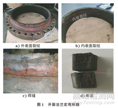 法蘭外壁未見腐蝕痕跡,內(nèi)壁覆蓋有薄層黑色物質(zhì),法蘭斷面平整,未見貝殼紋、纖維區(qū)和剪切唇區(qū),呈脆性斷裂特征,斷面覆蓋有黑色腐蝕產(chǎn)物。法蘭變徑段與直邊段交界處存在1處環(huán)向裂紋,裂紋處未見明顯塑性變形和減薄,呈脆性斷裂特征。裂紋位于法蘭與入口接管焊接接頭的熱影響區(qū),距焊趾約8.0mm,平行于焊縫,呈環(huán)向分布。外表面裂紋開口較大,最大開口間隙為2.0mm,內(nèi)壁裂紋長(zhǎng)約三分之一周長(zhǎng),開口較小,裂紋由法蘭外表面向內(nèi)表面擴(kuò)展。開裂法蘭宏觀形貌如圖1所示。