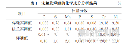 按照標(biāo)準(zhǔn)GB/T 11170—2008《不銹鋼 多元素含量的測(cè)定 火花放電原子發(fā)射光譜法(常規(guī)法)》對(duì)法蘭和焊縫進(jìn)行化學(xué)成分分析,結(jié)果如表1所示,可見其化學(xué)成分符合ASTM A182/A182M—2006 《高溫用鍛制或軋制合金鋼和不銹鋼法蘭、鍛制配件、閥門與部件》對(duì)F304H鋼的要求。