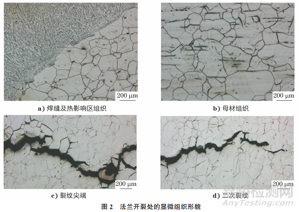 按照GB/T 13298—2015《金屬顯微組織檢驗(yàn)方法》對(duì)法蘭開裂處進(jìn)行顯微組織檢驗(yàn)。法蘭開裂處的顯微組織形貌如圖2所示。由圖2可知:法蘭焊縫區(qū)為均勻的樹枝狀鑄態(tài)組織,未見裂紋、氣孔等焊接缺陷;熱影響區(qū)組織為奧氏體,晶粒粗大,存在晶內(nèi)夾雜,多處晶界變寬,存在碳化物顆粒;法蘭基體組織為奧氏體,部分晶界處有碳化物顆粒,存在大量條狀?yuàn)A雜,按照GB/T 10561—2005 《鋼中非金屬夾雜物含量的測(cè)定 標(biāo)準(zhǔn)評(píng)級(jí)圖顯微檢驗(yàn)法》評(píng)定為2.5級(jí)。未裂透部位裂紋沿晶擴(kuò)展,存在二次裂紋,晶粒內(nèi)和晶界處分布著彌散碳化物顆粒,存在敏化現(xiàn)象。
