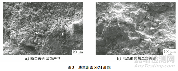 對(duì)法蘭斷面進(jìn)行SEM分析,結(jié)果如圖3所示。法蘭斷面被腐蝕產(chǎn)物覆蓋,未見裸露斷口;清除腐蝕產(chǎn)物后,斷口呈冰糖狀花樣,為典型沿晶斷口形貌,并可見多處沿晶二次裂紋,晶界處存在大量細(xì)小析出物。