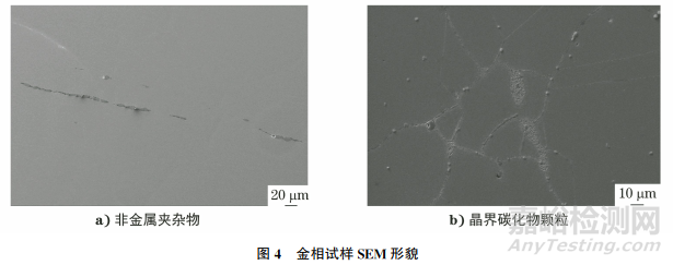 使用掃描電鏡對(duì)基體金相試樣(觀察面垂直于法蘭端面)進(jìn)行觀察,結(jié)果如圖4所示,由圖4可知:拋光態(tài)下基體上可見條狀非金屬夾雜物,晶界上存在大量碳化物顆粒。
