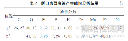 對(duì)法蘭斷面的腐蝕產(chǎn)物進(jìn)行能譜分析,其中兩個(gè)位置的腐蝕產(chǎn)物元素組成如表2所示。由表2可知:斷口表面腐蝕產(chǎn)物中均含有S元素,無(wú)Cl元素,其中S元素質(zhì)量分?jǐn)?shù)最高達(dá)11.31%。