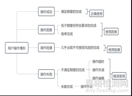 如圖3所示,用戶實(shí)際使用醫(yī)療器械的操作情形較為復(fù)雜,本指導(dǎo)原則根據(jù)操作任務(wù)完成程度將其分為操作成功、操作困難、操作險肇、操作失敗。