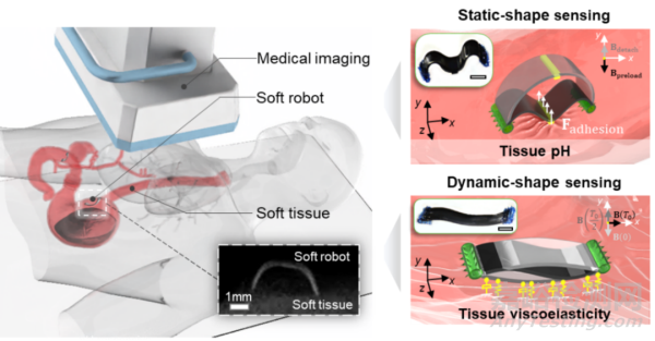 而本次工作通過結(jié)合無線軟體機器人和醫(yī)學成像,來感知組織的一些高級生理特性比如器官深處的粘附力、pH 值和粘彈性。