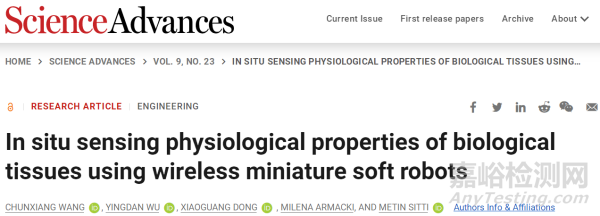日前,相關(guān)論文以《基于無線微型軟體機器人的生物組織生理特性原位檢測》(In situ sensing physiological properties of biological tissues using wireless miniature soft robots)為題發(fā)在 Science Advances 上[1]。