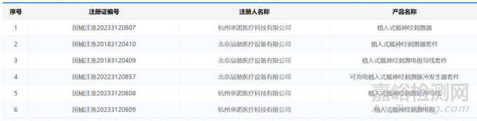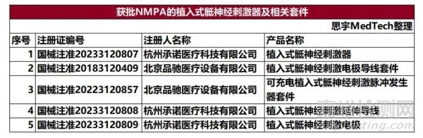 截止發(fā)稿日,國家藥品監(jiān)督管理局批準了北京品馳醫(yī)療、杭州承諾醫(yī)療的植入式骶神經刺激器。信息如圖所示。