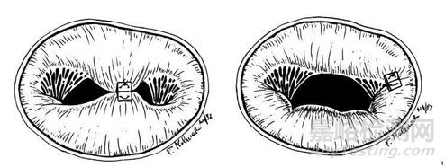 二尖瓣緣對(duì)緣修復(fù)技術(shù)(edge-to-edge repair)在1991年由意大利學(xué)者Alfier提出,該技術(shù)是指將二尖瓣進(jìn)行緣對(duì)緣縫合,從而使二尖瓣雙孔化(A2/P2區(qū))或者關(guān)閉A1/P1或A3/P3區(qū)對(duì)合緣達(dá)到治療反流的目的(見(jiàn)圖1、圖2)。而二尖瓣夾合器系統(tǒng)則是基于外科二尖瓣緣對(duì)緣修復(fù)技術(shù),利用機(jī)械夾合的原理,通過(guò)經(jīng)導(dǎo)管介入手術(shù)植入人體后,二尖瓣夾合器的上夾、下夾夾持住二尖瓣瓣葉,成“V”形的上下夾兩臂向中線靠攏,同時(shí)帶動(dòng)所夾合的組織向中線靠攏,收入閉合環(huán)后即鎖定,然后釋放夾合器。植入二尖瓣夾合器后,可減少二尖瓣的反流,達(dá)到治療反流的效果。