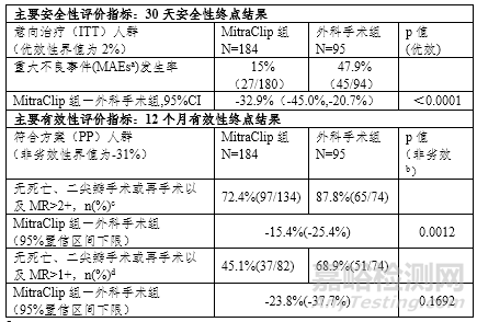 根據(jù)FDA公開(kāi)的審評(píng)信息,盡管RCT研究證實(shí)MitraClip System可以被安全植入并降低大部分患者的二尖瓣反流,但有效性不及外科手術(shù)(具體臨床試驗(yàn)結(jié)果見(jiàn)表1),因此該臨床研究不足以支持MitraClip System在手術(shù)候選人群中使用。