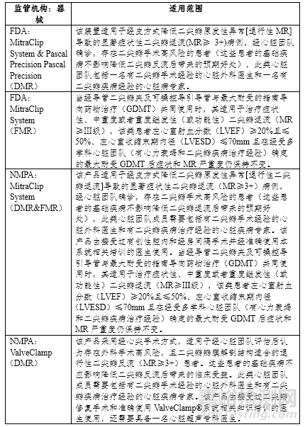 在中國(guó), MitraClip System經(jīng)導(dǎo)管二尖瓣夾及可操控導(dǎo)引導(dǎo)管主要通過(guò)提交境外臨床試驗(yàn)數(shù)據(jù)進(jìn)行臨床評(píng)價(jià),還補(bǔ)充了來(lái)自文獻(xiàn)的中國(guó)人群、亞太人群的臨床經(jīng)驗(yàn)數(shù)據(jù),并于2020年6月15日和2021年4月20日獲批(完整適用范圍見(jiàn)表1)。