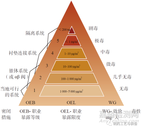 圖1 為OEB和OEL職業(yè)暴露對應關系的三角形。定義了API藥物的OEB及OEL,就可以知道需要什么級別的污染控制并采取相應的密閉隔離措施。
